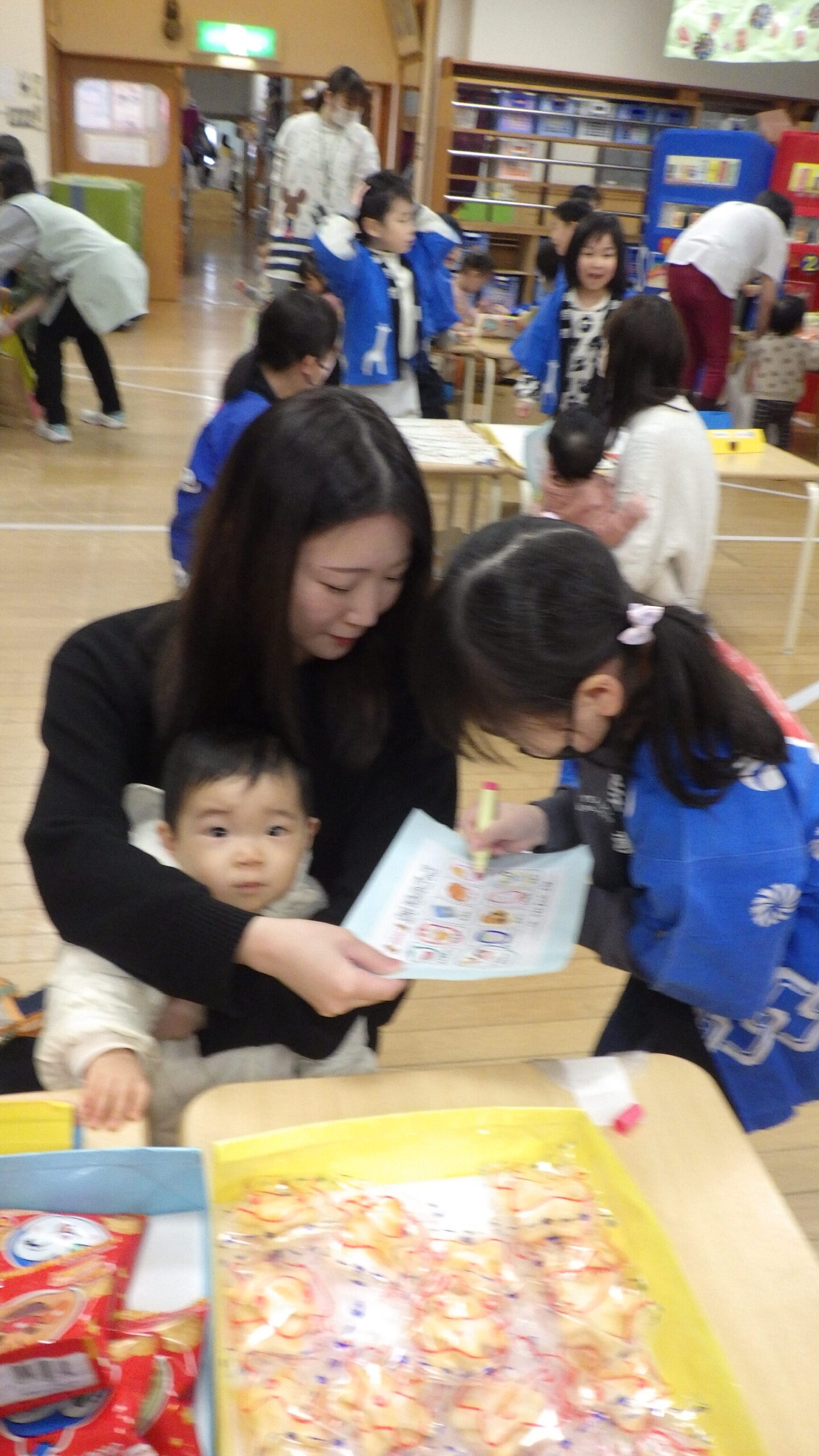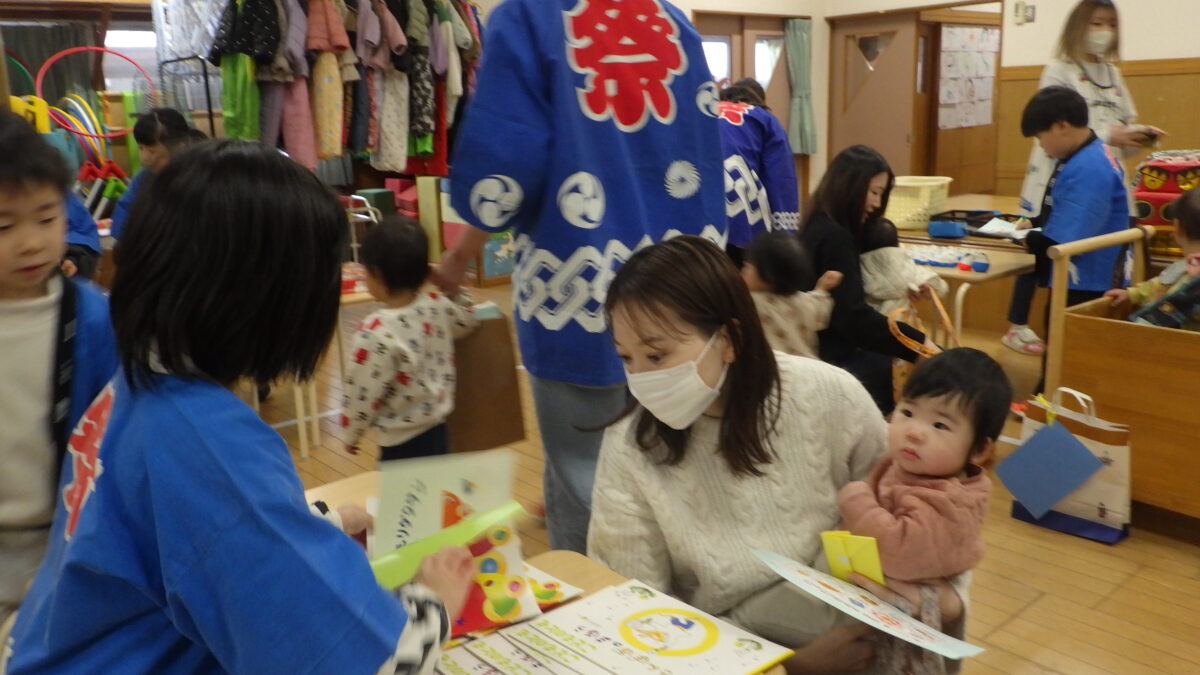 たくさんのお店にわくわくしたり、迫力ある雰囲気にドキドキしながら親子で買い物し、売り手の年長組のお友だちともやりとりして楽しい時間となりました。