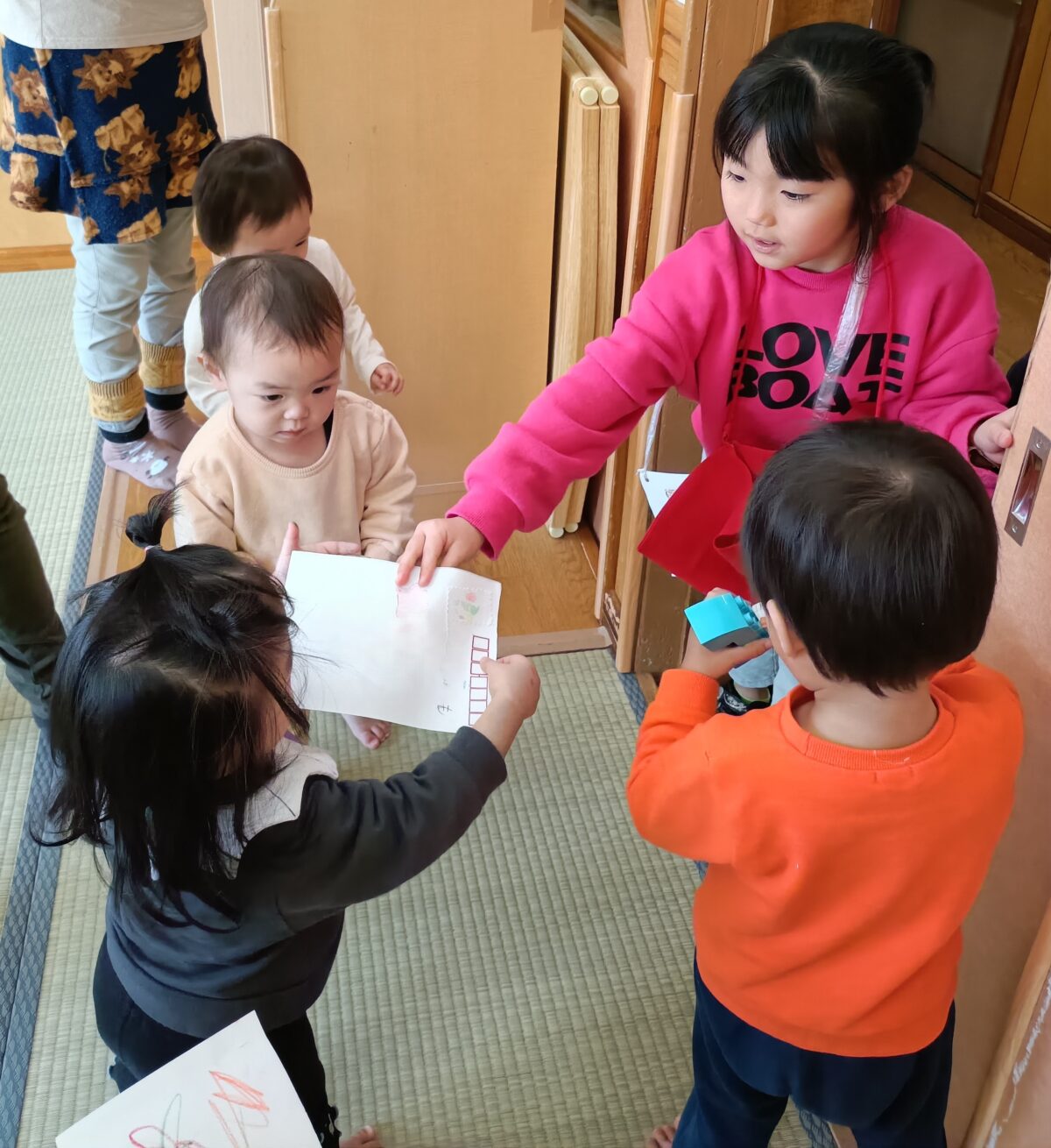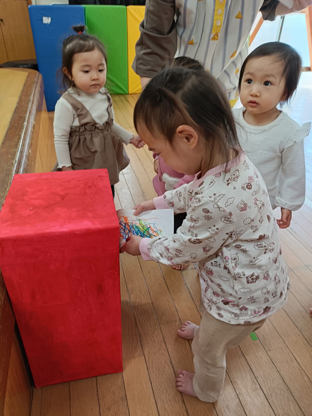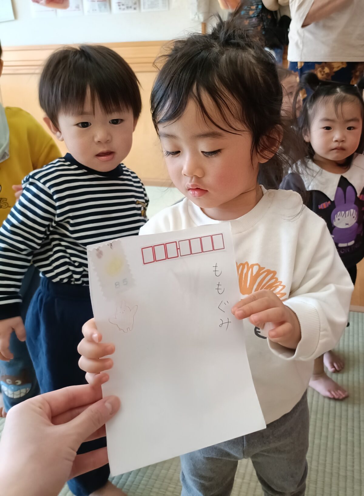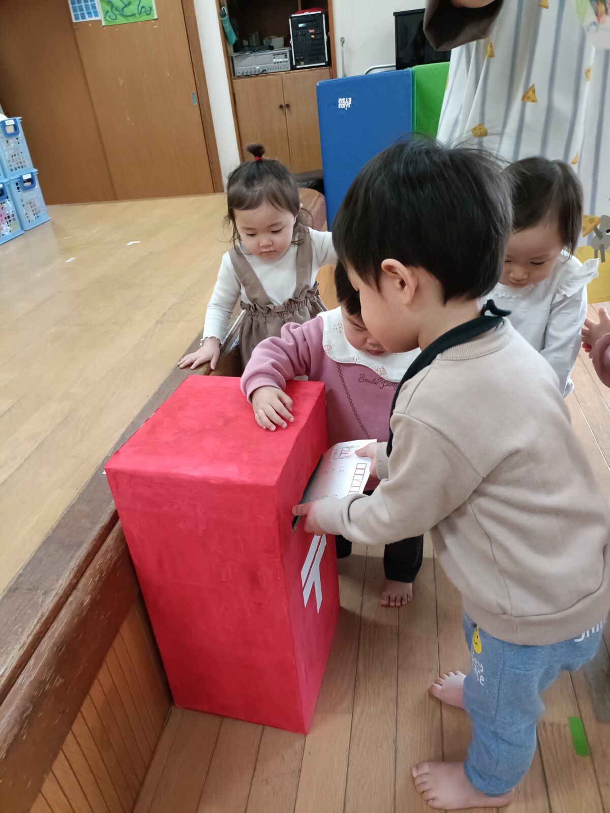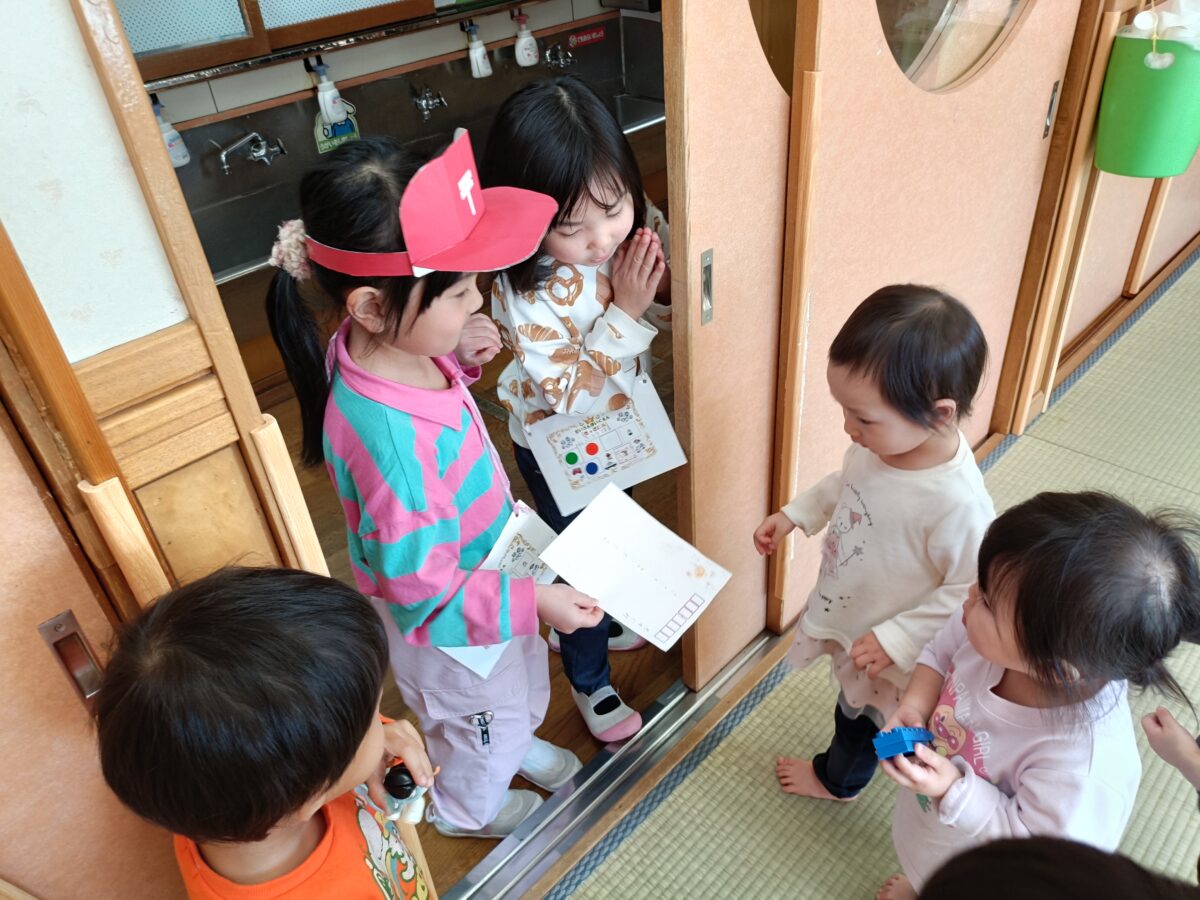お絵描きしたハガキをポストへ投函したら、郵便屋になったお兄さんお姉さんが配達してくれました。