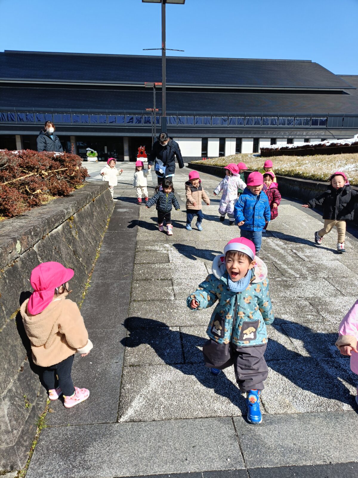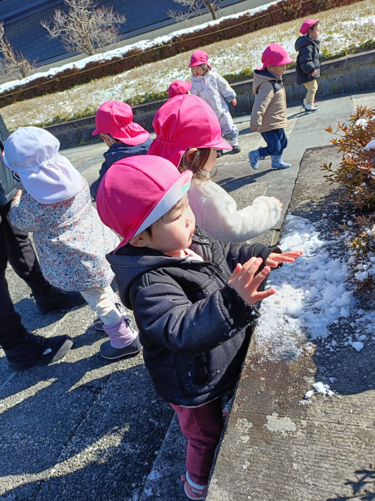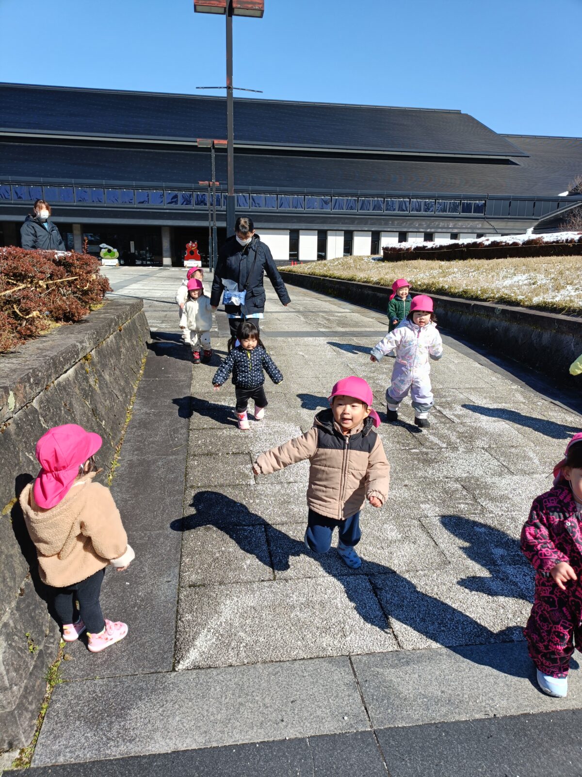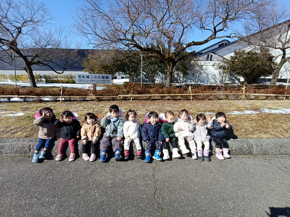 晴れた日に博物館までお散歩へ。すみれ組さんと駆けっこしたり、雪を触って遊びました。これから、たくさんお散歩行こうね!