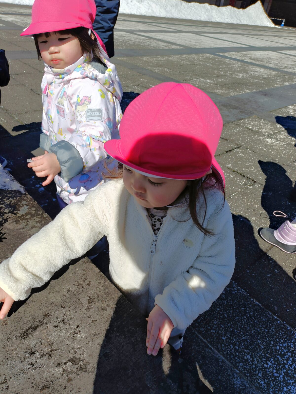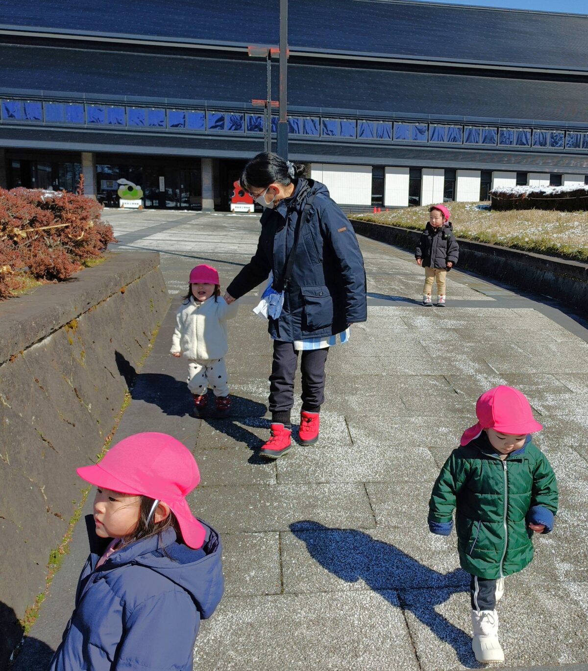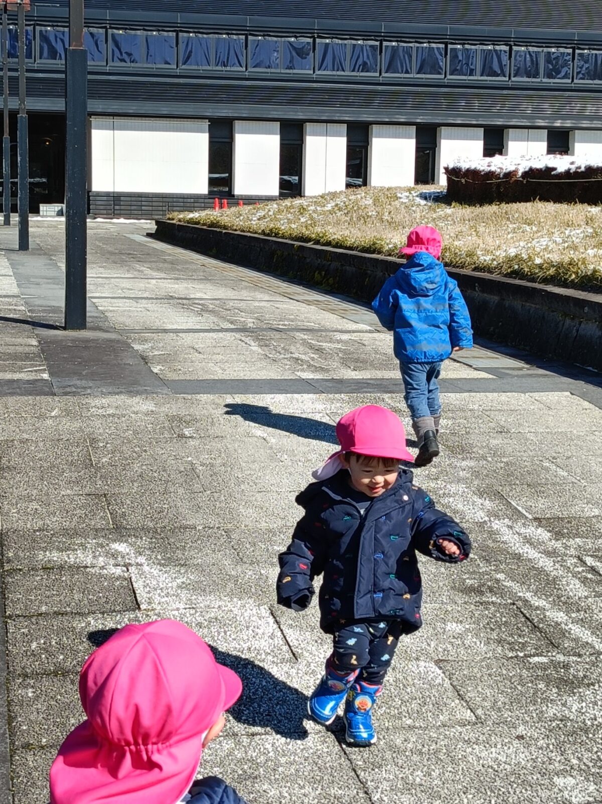 晴れた日に博物館までお散歩へ。すみれ組さんと駆けっこしたり、雪を触って遊びました。これから、たくさんお散歩行こうね!